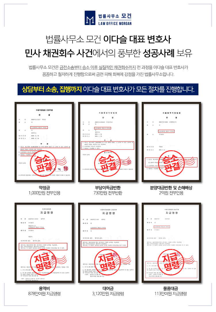 법률사무소 모건의 이다슬 대표 변호사는 민사소송변호사이자 지급명령 사건은 전문으로 진행해 온 변호사로서 다수의 지급명령 사건에서의 풍부한 성공사례를 보유하고 있습니다. 소액채권이라도 최선을 다한 법률조력을 제공하고 있으니 경험많은 지급명령변호사와 함께하신다면 원하시는 결과를 기대하실 수 있을 것 입니다.