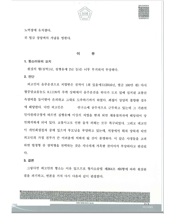 의뢰인은 공무직인데 2회째 음주운전으로 1심에서 집행유예를 선고받고 당연퇴직을 면하기 위해 저를 찾아오셨습니다.