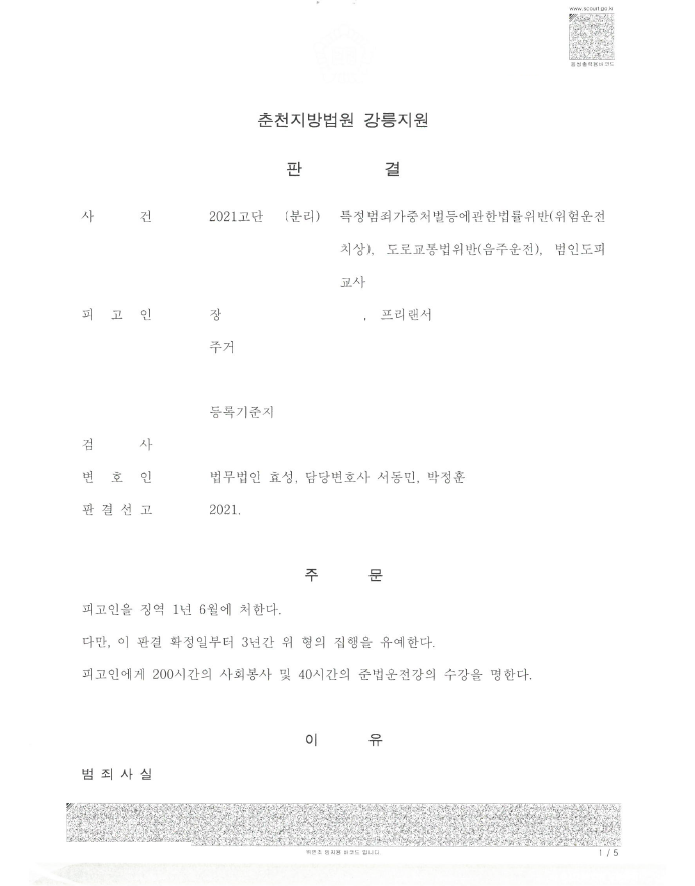 저는 즉각 공판재개신청을 하여 공판을 재개시킨 후 피해자와 합의를 하여 합의서 등을 재판부에 제출하면서 이 사건의 경위, 운행 거리, 알콜 수치, 합의 등을 중점적으로 주장 소명하였습니다. 이에 법원은 집행유예를 선고하였습니다.