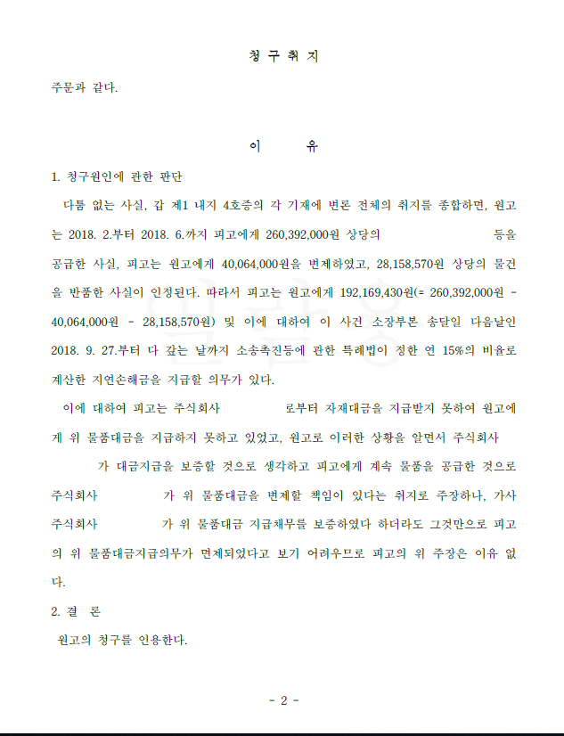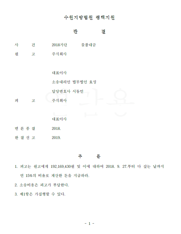 저는 즉각 물품대금청구소송을 제기하였고 요건사실을 모두 주장 입증한 후 피고의 주장은 보증채무의 법적 성질상 이유 없음을 주장하였습니다. 법원은 저희의 주장을 모두 받아들이고 피고의 주장을 배척하여 전부 승소 판결을 선고하였고 의뢰인은 미수금을 전부 회수하였습니다.