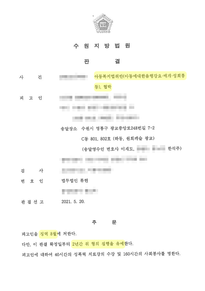 위와 같은 변호인의 주장을 받아들인 검찰은 의뢰인의 행위를 ‘폭행이나 협박으로 아동청소년으로 하여금 아동청소년의 성을 사는 행위의 상대방이 되게 하는 것’의 미수가 아닌 협박 및 아동복지법위반으로만 구공판하였으며, 법원은 의뢰인의 각종 유리한 정상을 감안하여 의뢰인에게 “징역 8월에 집행유예 2년”을 선고하면서 신상공개명령, 고지명령 및 취업제한은 면제하였습니다.