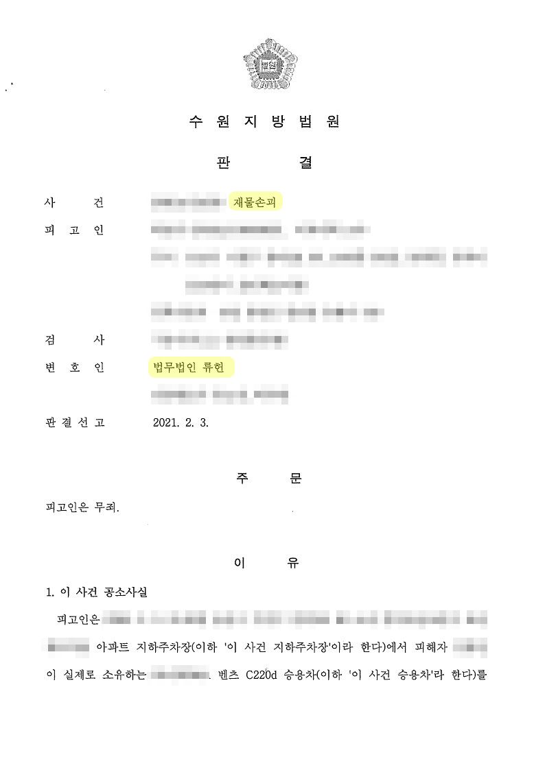 변호인이 위와 같이 피해자에 대한 증인신문, CCTV에 대한 검증 및 감정과 여러 차례에 걸친 서면 제출을 통하여 ① 언제부터 언제까지의 지하주차장 CCTV 영상을 확인한 뒤 의뢰인을 피혐의자로 특정하였는지에 관한 피해자의 진술에 일관성이 없는바 피해자와 경찰이 범행 추정 시간대의 CCTV 영상을 모두 확인하여 의뢰인을 피혐의자로 특정한 것인지 의심스럽다는 점, ② 위 지하주차장 CCTV에는 피고인이 피해자 소유 승용차를 둘러보는 모습만이 촬영되어 있을 뿐 피고인이 위 승용차를 손괴하는 모습은 촬영되어 있지 않다는 점, ③ 피해자가 증인신문 과정에서 ‘승용차가 긁힌 것을 발견한 일시 및 장소 등’에 관하여 검사가 제출한 증거와도 명백히 배치되는 거짓 진술을 했다는 점 등을 논거로 의뢰인의 무죄를 강력히 주장한 결과, 1심 법원은 위와 같은 변호인의 주장을 거의 그대로 받아들여 판결문에 인용하면서 의뢰인에게 “무죄”를 선고하였습니다.