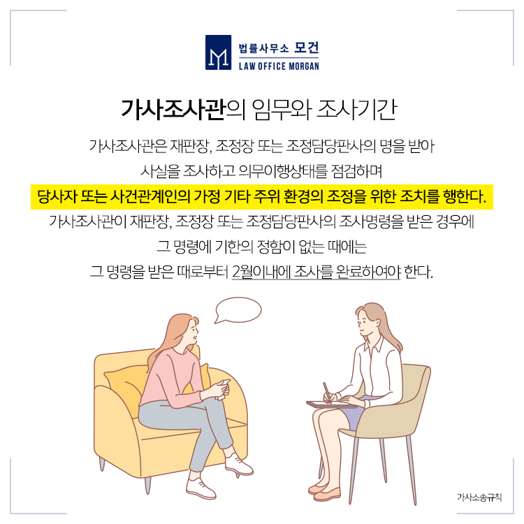 가사조사관은 담당 판사의 가사조사 명령을 받아 이혼 당사자 또는 자녀의 가정 기타 주위 환경 등을 자세히 조사하는 역할을 하는데요. 가사조사의 기간은 2개월 가량으로, 가사조사관은 조사 사실을 기재한 가사조사보고서를 재판부에 제출하게 됩니다. 재판부는 이러한 가사조사보고서와 변론에서 나타난 여러 사정을 종합하여 살펴보고 이혼의 주요 사항을 판단하게 되기 때문에 가사조사를 본인에게 유리하기 진행하기 위해서는 이혼전문변호사의 충분한 법률자문 하에 임하는 것이 바람직합니다.