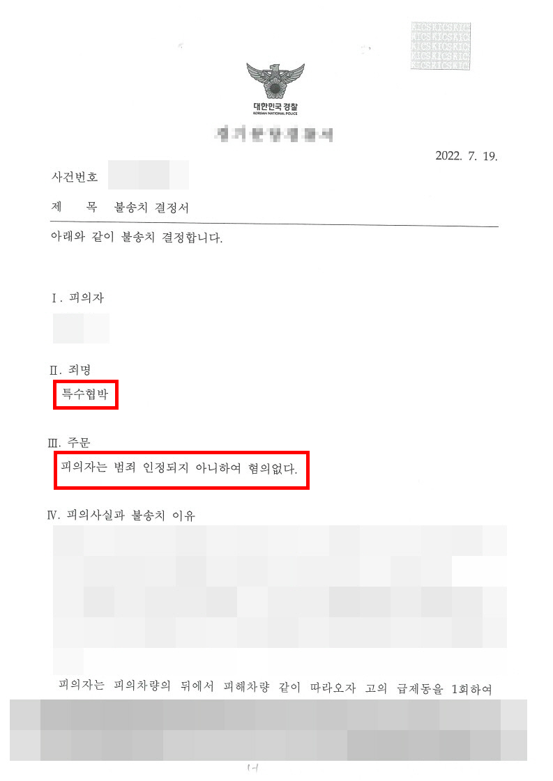 보복운전하여 특수협박으로 신고당했으나, 보복의 고의가 없었다는 점을 증명해 경찰단계에서 혐의없음 불송치결정을 받아낸 성공사례