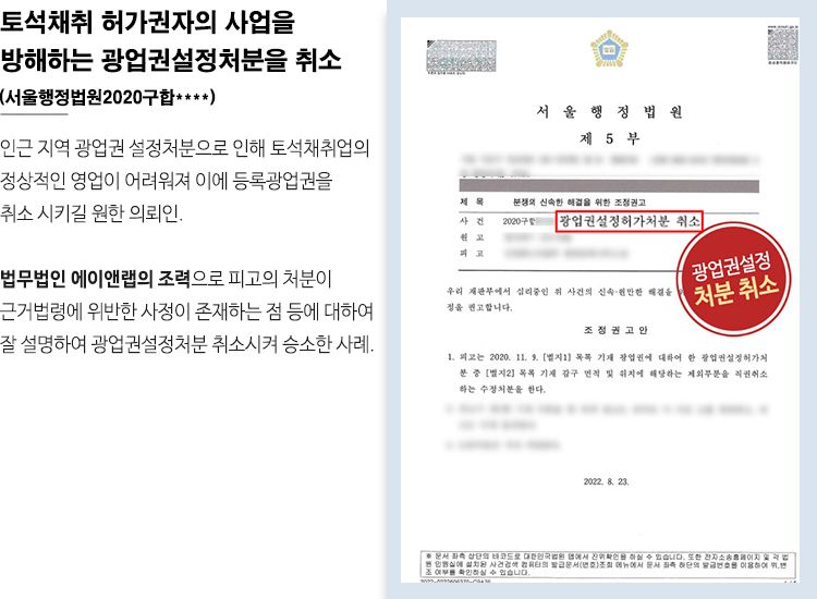 본 사건은 토석채취허가와 광업권에 관한 전문적 식견을 바탕으로 중소기업의 사업권을 보호해낸 건으로서, 법무법인 에이앤랩 행정그룹의 전문성이 여실히 드러난 대표적 사례입니다.