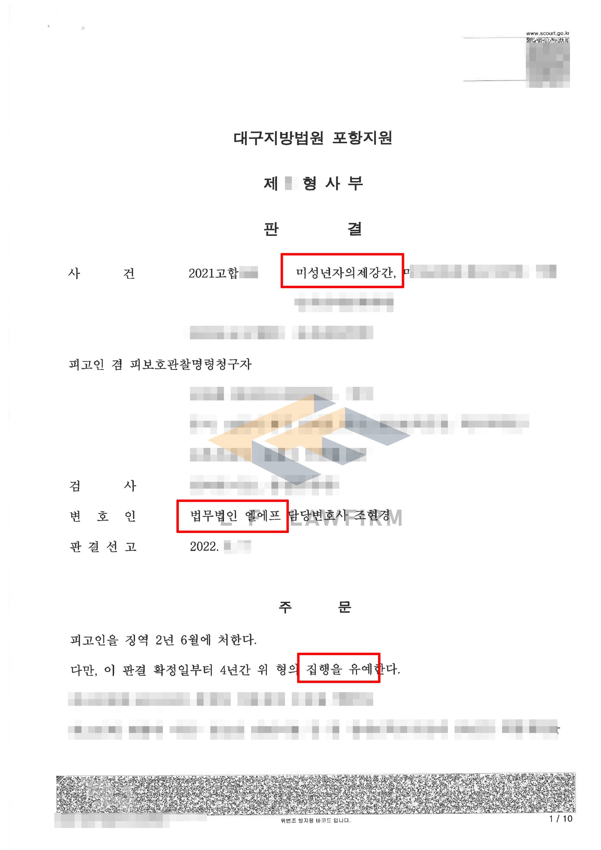 사건 당시 의뢰인이 합의 하에 성관계를 하였어도 상대 여성의 나이 때문에 처벌을 받을 수 있는 상황이었고 다른 사건보다 형벌이 엄한 상황이고 합의가 되지 않으면 실형이 선고되기에 합의에 대한 부담이 매우 큰 상황이었습니다. 재판이 진행되며 조심스럽게 피해자 측과 접촉하며 합의에 관한 이야기를 하게 되었고 시간을 조급하게 갖지 않고 진행한 결과 처벌불원서까지 받을 수 있었습니다. 이후 정상자료를 꾸준히 제출한 결과 최종 집행유예 판결을 받을 수 있었습니다.