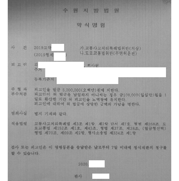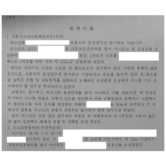 의뢰인은 이미 음주운전으로 면허가 취소되어 무면허 상태에서 운전을 하다가 피해자를 치어 약 5주간의 상해를 입혔습니다. 의뢰인은 비록 10여년 전이긴 하지만 수 회의 동종전과(음주운전, 무면허운전, 교특법위반, 특가법위반 등)가 있어 아주 불리한 상황이었습니다.