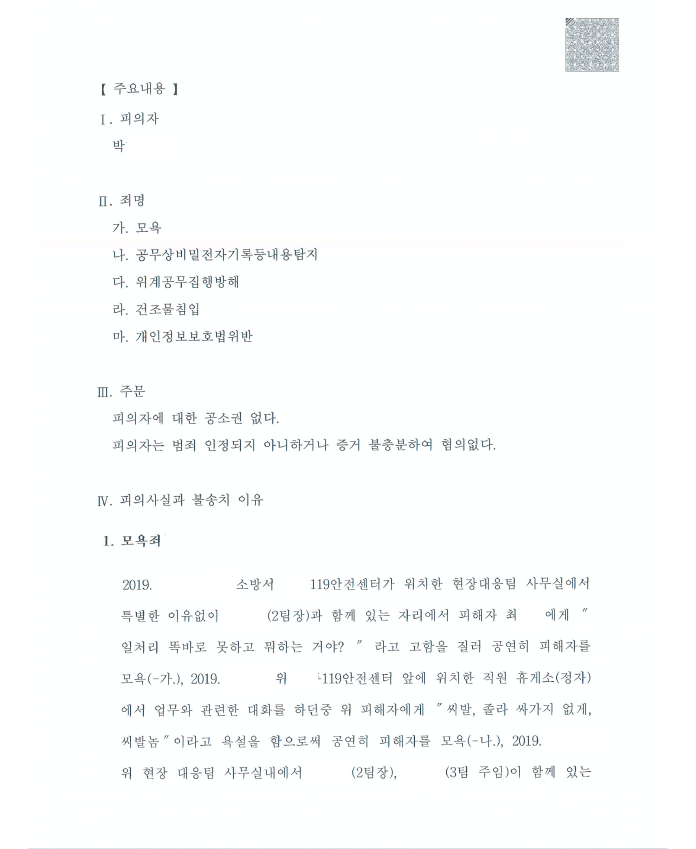 의뢰인은 공무원인데 직장 하급자에게 욕설이 섞인 훈계를 하고 시스템에 접속하여 하급자에 대한 정시 출퇴근 등 출입기록 영상정보를 무단으로 열람 내지 취득하였다고 하여 모욕, 공무상비밀전자기록등내용탐지, 위계공무집행방해, 건조물칩입, 개인정보보호법위반으로 형사고소당하였고 즉시 저를 찾아오셨습니다.