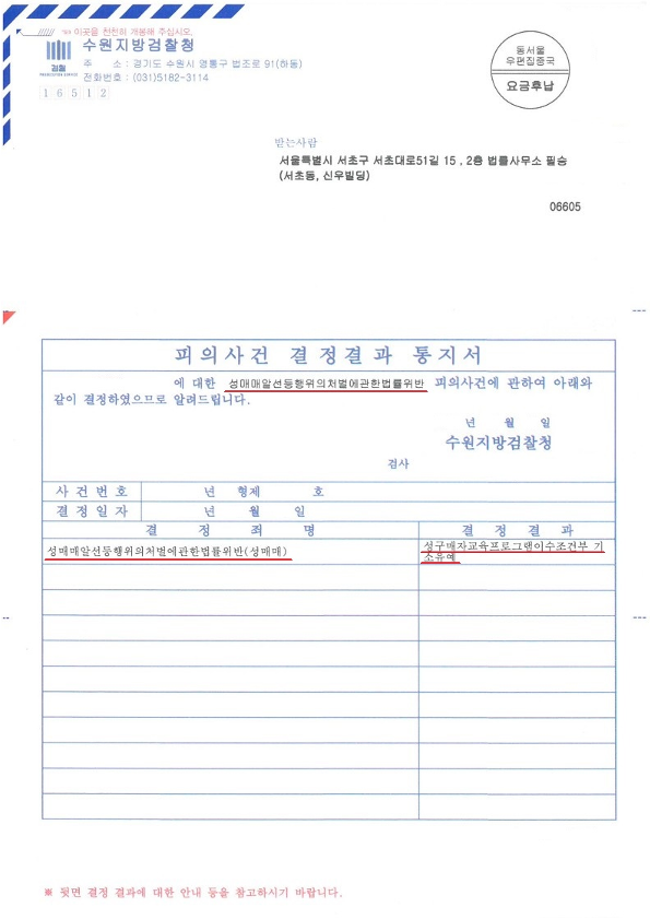 이와 함께 그 동안 많은 성매매 사건을 진행하고 모든 사건을 기소유예처분으로 종결시킨 경험을 토대로 확보한 다양한 양형자료들을 안내해드렸고, 경찰 단계 및 검찰 재판 단계별로 양형자료들을 제출하는 시기를 설정해 드렸습니다.