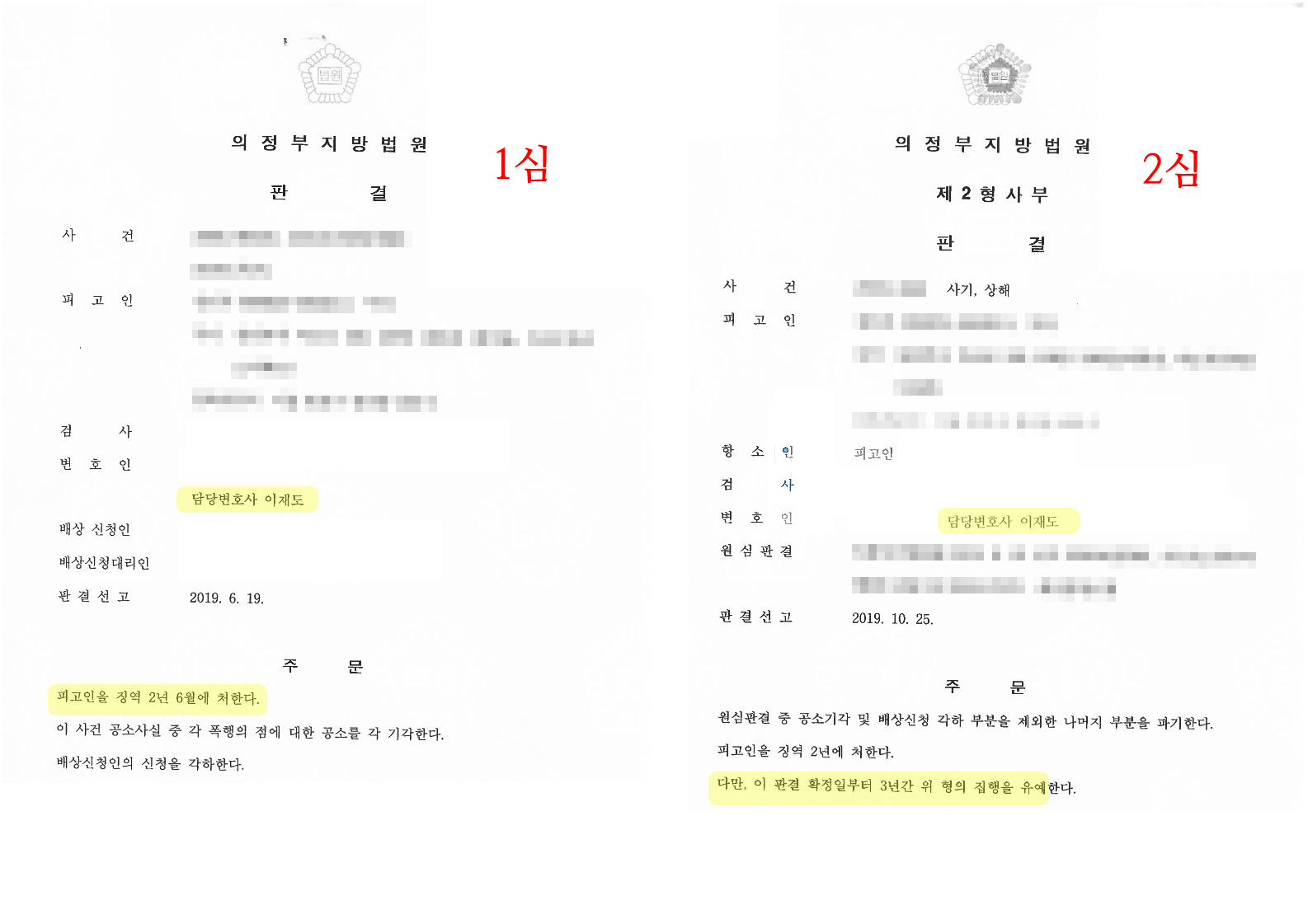 1심은 의뢰인에게 징역 2년 6월의 실형을 선고하였으나, 2심은 의뢰인에게 징역 2년, 집행유예 3년을 선고하였고, 의뢰인은 선고 후 가족 곁으로 돌아올 수 있었습니다.
