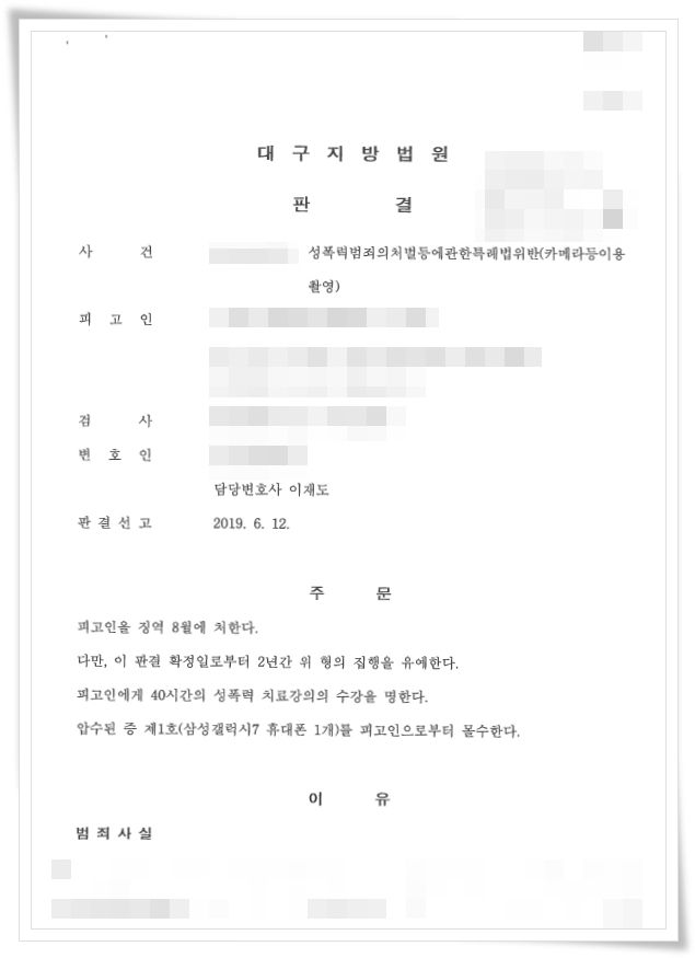 본 사건은 ‘성폭력범죄의처벌등에관한특례법위반(카메라등이용촬영)죄’로 기소된 사건으로, 최근 매우 빈번하게 발생하는 대표적인 성범죄 사건이자 처벌강도가 점차 높아지는 유형의 사건입니다. 피고인이 자신의 범행사실을 모두 인정하고 있고, 피고인의 범행을 증명할 사진증거들이 명백하게 존재하고 있어 변호인은 피고인의 정상변론에 집중하기로 하였습니다.