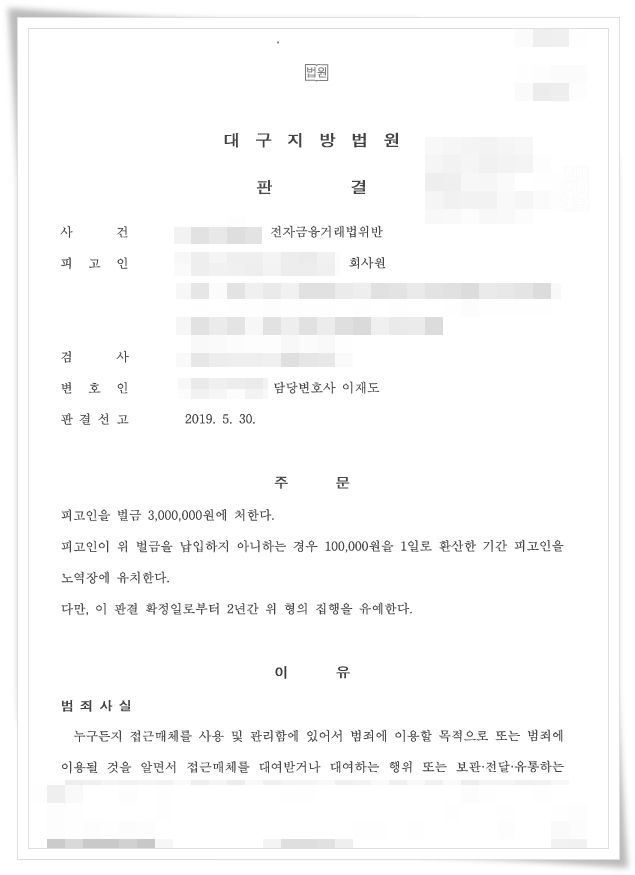 체크카드나 예금통장(계좌) 등을 타인에게 대여하는 행위들은 보이스피싱이나 범죄단체의 불법적인 자금세탁 등에 이용되므로 제3자의 범행을 용이하게 한다는 점에서 피해의 파급력이 매우 크고, 선량한 피해자들을 양산합니다. 따라서 최근 이와 같은 범행에 대해서는 수사기관이나 법원이 특히 엄중하게 처벌을 강화하고 있는 추세이므로 사건의 처리가 상당히 까다로운 사건이었습니다.