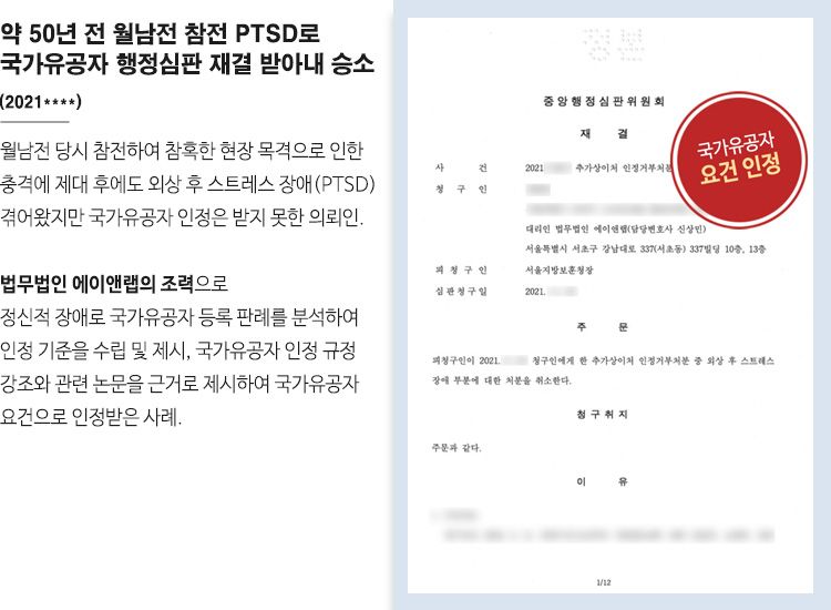 중앙행정심판위원회는 약 8개월의 심리 끝에 “청구인 파월 당시 생명이나 신체에 중대한 위협을 받는 정도의 심각한 외상을 겪은 사실을 인정할 수 있다”며 “비록 청구인이 전역 후 약 45년이 지난 시점에 처음으로 이 사건 상이에 관한 진료를 받았으나, 진단서의 기재내용과 청구인의 태도에 비추어 보았을 때 이 사건 상이의 발병시점을 청구인이 처음 진료 받은 시점으로 볼 수 없다”는 이유로 보훈청의 거부처분을 취소하는 인용 재결을 내렸습니다.