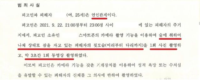 회사원 A씨는 여성 B씨와 연인관계로 지내며 2021. 9. 22. 21:00경 술에 취하여 나체 상태로 잠을 자고 있는 B씨의 뒷모습을 몰래 사진 촬영하고 동영상 촬영하였습니다.
