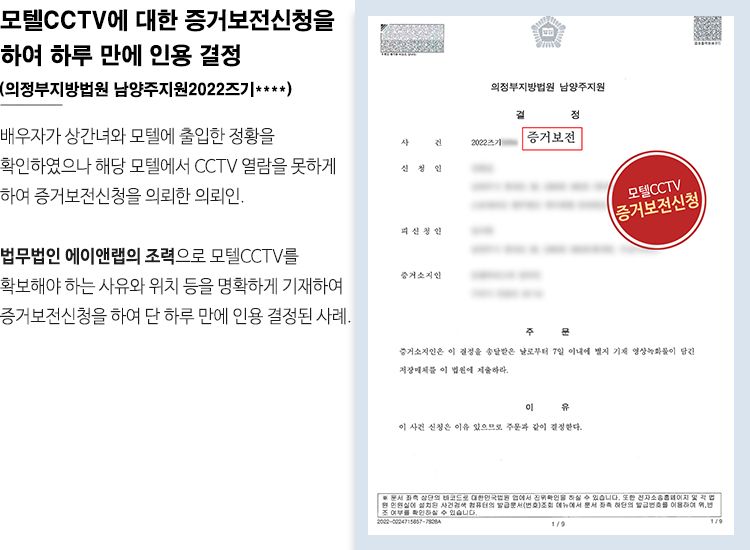 사건을 담당한 대한변협 등록 가사법 전문 유선경 변호사는 혼인기간 중에 있었던 여러가지 사정들과 불륜 관련 여러 정황 증거들을 확인하며 부정행위 여부를 판단하였습니다. 그중에서 해당 모텔 CCTV와 직접 관련된 내용만을 추려서 증거를 확보해야 하는 사유와 CCTV 위치 등을 명확하게 기재하여 의정부지방법원 남양주지원에 증거보전신청서를 제출하였습니다.