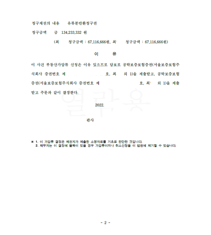 저는 즉각 본안소송 및 부동산가압류신청을 하면서 피보전채권 및 보전의 필요성을 구체적으로 주장 소명하였고 법원은 저희의 주장을 모두 받아들여 현금공탁이 아닌 보증보험증권으로 갈음하는 인용 결정을 내려 부동산을 가압류하였습니다.