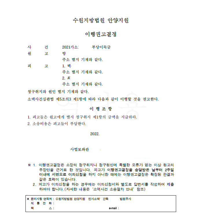 저는 즉각 입금 받은 자들을 피고로 하여 민사소송 부당이득반환청구소송을 제기하였고 법원의 저희의 주장을 모두 받아들여 이행권고결정을 내렸고 피고들은 이를 송달받고 이의하지 않아 승소 확정되어 의뢰인은 피해액을 반환받았습니다.