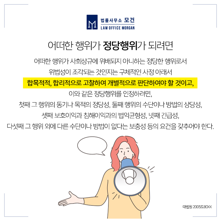 또한 A씨의 수단이나 방법이 상당하다거나 나아가 당시 그와 같은 피고인의 행위가 긴급하고도 불가피한 수단이었다거나 대체 가능한 다른 수단이 없는 유일한 방법이었다고 보기 어려워 정당한 행위로서 위법성이 조각된다고 할 수 없다고 보고 1심에서 인정된 벌금 100만원이 대법원에서 확정된 사례입니다(대법원 2021도6XXX).