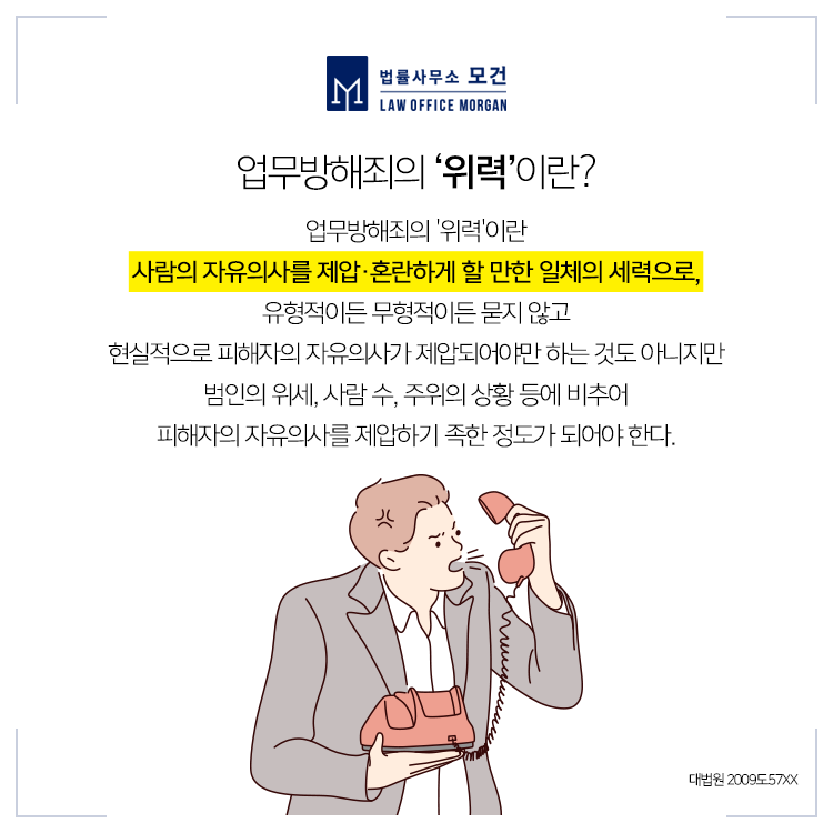 「형법」 에서는 위력으로써 타인의 업무를 방해한 경우를 '업무방해죄'로 형사처벌하고 있습니다. 업무를 방해한다는 의미는 업무의 집행 자체를 방해하는 것은 물론이고 널리 업무의 경영을 저해하는 것도 포함하는데요.