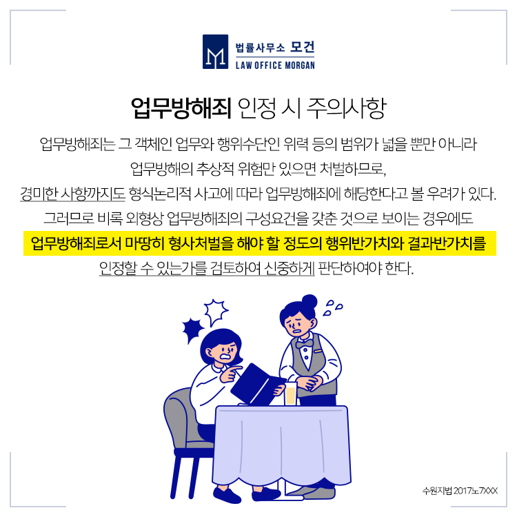 업무방해죄는 본인의 행위가 타인의 업무를 방해하게 될 가능성 또는 그에 대한 인식이나 예견으로도 충분히 고의성이 인정될 수 있습니다. 반면 그 행위가 다소 불편함을 초래하거나, 불쾌한 감정을 주는 무례한 행동이라 하더라도 그 정도가 업무방해죄에서 요구하는 '위력'에 해당되는 정도에 이르지 못하였다면 범죄라 볼 수 없습니다.