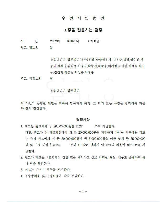 저는 항소심에서 이 사건의 경위, 대여에 관한 기타 정황증거로 대여사실을 구체적으로 주장 입증하였고 법원은 피고가 원고에게 대여금을 지급하라는 강제조정을 내려 확정되어 의뢰인은 대여금을 변제받았습니다.