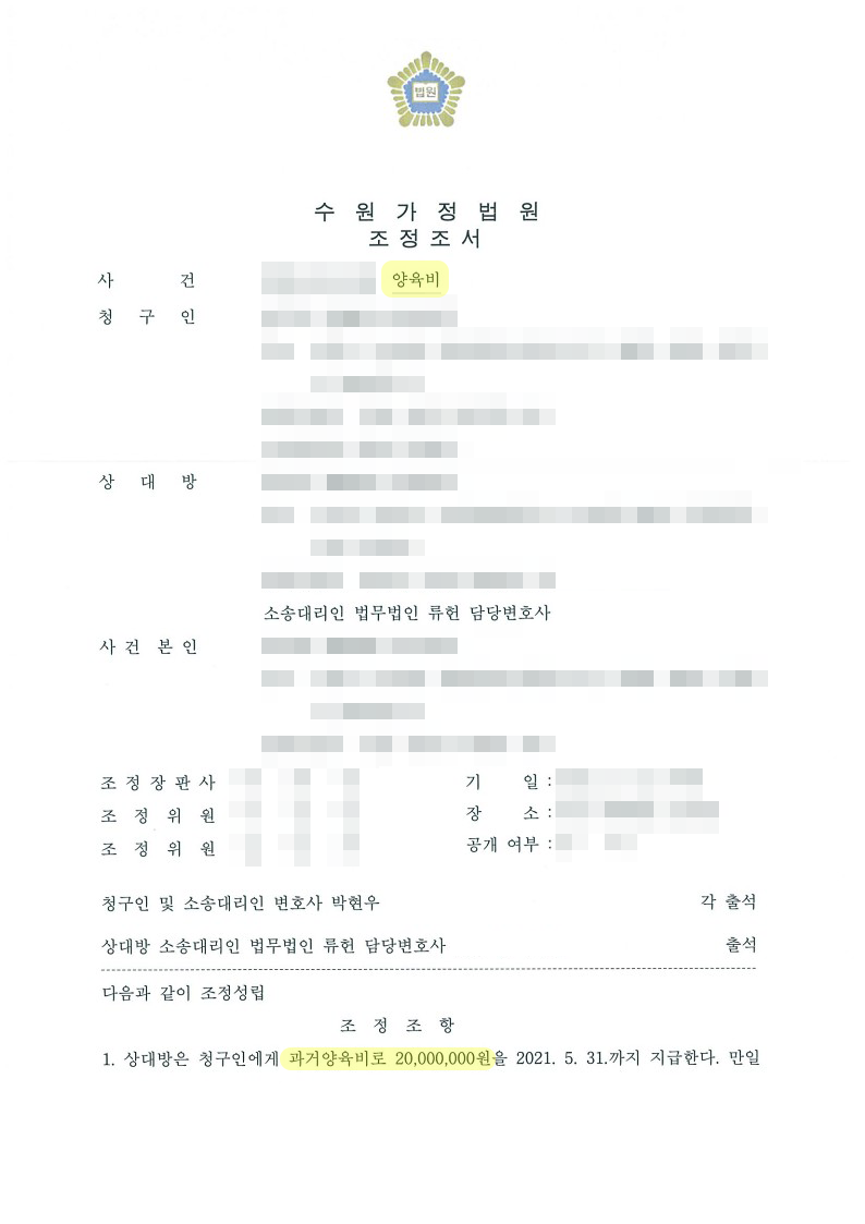 소송대리인이 끈질기게 청구인을 설득한 끝에, 마침내 ‘상대방은 청구인에게 과거양육비로 2,000만 원을 2021. 5. 31. 까지 지급하고, 청구인은 향후 상대방에게 더 이상의 과거양육비를 청구하지 않는 것’으로 조정이 성립되었습니다. 이로써 소송대리인은 청구인의 당초 청구금액인 114,000,000원에서 94,000,000원을 감액하는 성공적인 소송 결과를 이끌어 내었고, 의뢰인은 과거 청구인과의 악연으로부터 종국적으로 벗어날 수 있었습니다.
