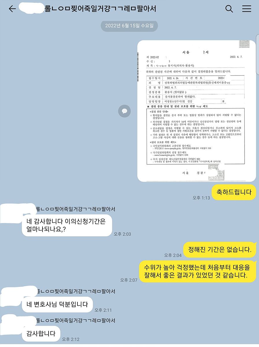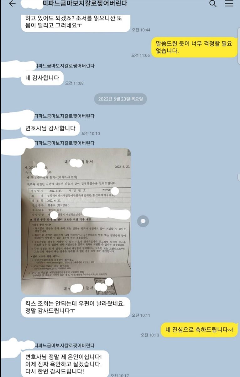 서울 대부분의 경찰서를 자주 가고는 있으나 특히 위 사건을 변호했던 송파경찰서는 정확히 세어보지는 않았지만 통매음으로 불송치 받은 것만 두 자릿수 정도는 되지 않나 싶습니다. 뭉뚱그려 하나의 주장을 하는 사람들이나 변호사들도 있으나, 저는 항상 채팅 내용을 분석하여 성적인 것이 아닌 것은 제외시켜서 일단 양을 줄이고 성적인 것이 아닌 의미로 받아들여질 수 있다고 판단되는 것은 반드시 구체적인 자료를 첨부하여 제외시키고 있습니다. 남은 부분이 있다면 이에 대하여 적절히 방어할 수 있는 주장을 하고 구체적인 자료를 첨부하고 유사 사건에서 무혐의로 종결된 것이 있다면 이 역시 인용하면서 첨부하고 있습니다. 물론 제가 받은 무죄판결문과 확보하고 있는 무죄판결문은 당연히 첨부하고 있습니다.