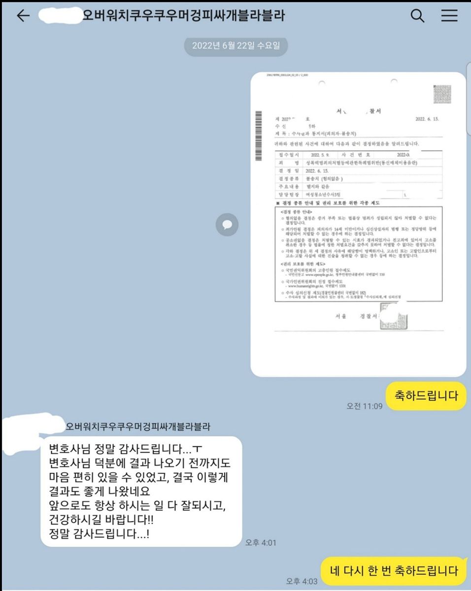 수위가 높은 만큼 철저히 자료를 확보하고 의견서를 작성하였고 기쁜 소식을 전달해줄 수 있었습니다.