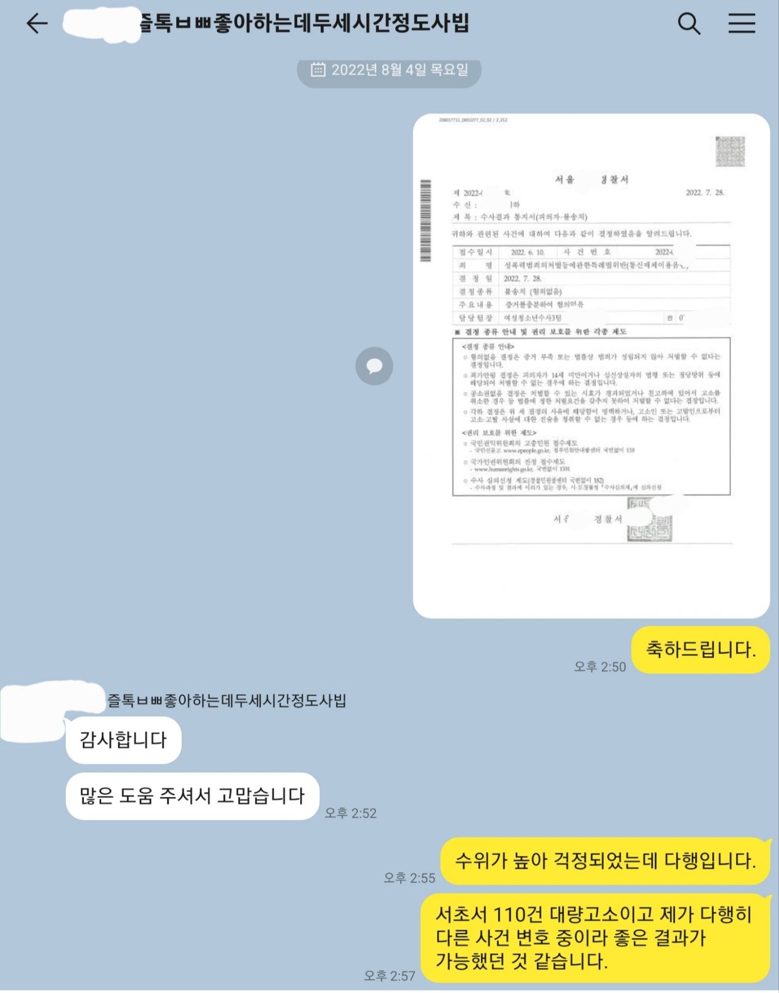 즐톡(즐겁게톡)의 경우 음란채팅이 자주 이루어지고 있는 대표적인 어플입니다. 이 사건이 서초서에 접수된 110건 대량고소라는 것을 이미 알고 있었습니다. 서초서 대량고소 건은 다수 어플을 망라하여 수집 후 고소에 이르렀고, 고소대리인은 예상과 달리 검찰전관출신 변호사입니다. 그 고소 건 관련해서 고소장 내용 중 어떤 부분이 진실이 아닌 허위가 있다는 것도 정확히 알고 있으며, 고소인의 직업이나 나이 등 정보도 정확히 파악하고 있어 쉽게 해결할 수 있었습니다. 알다시피 저는 통매음 고소대리는 맡지 않고 있습니다. 통매음 고소가 핫하고 쉽게 돈을 벌 수 있기 때문에 회식자리에서 고용변호사님이 언급하기도 하였으나, "여청 수사관분들 업무가 과중하여 고생하는 것 뻔히 알고 있고 맨날 보는데, 낯부끄러워서 어떻게 입회하냐 그렇게까지 돈 안 벌어도 된다"는 말을 하기도 하였습니다.