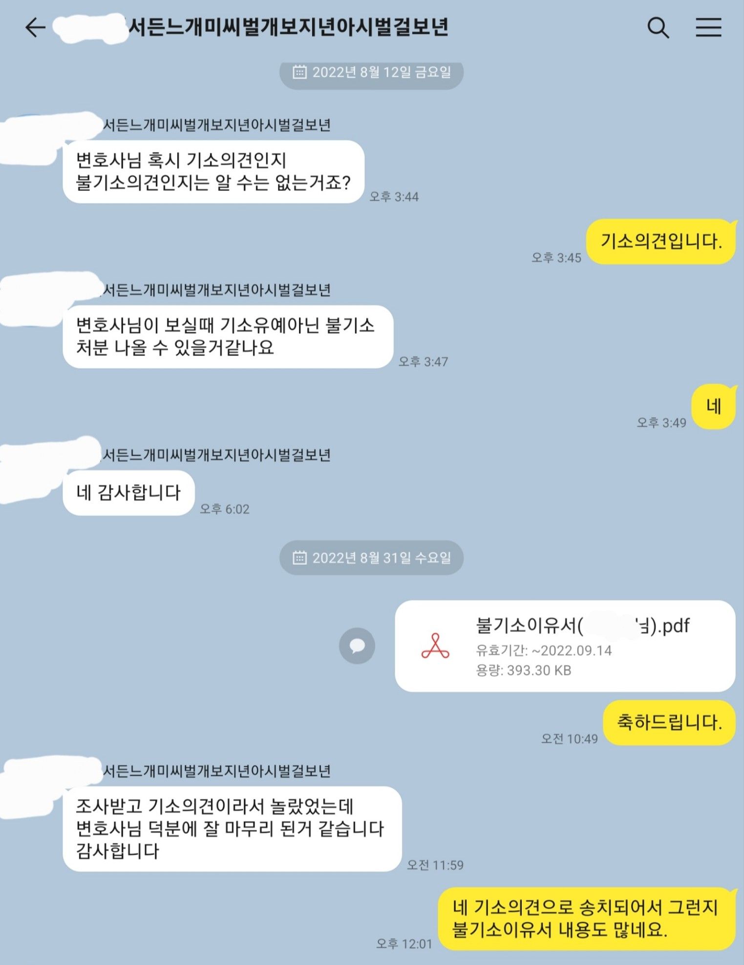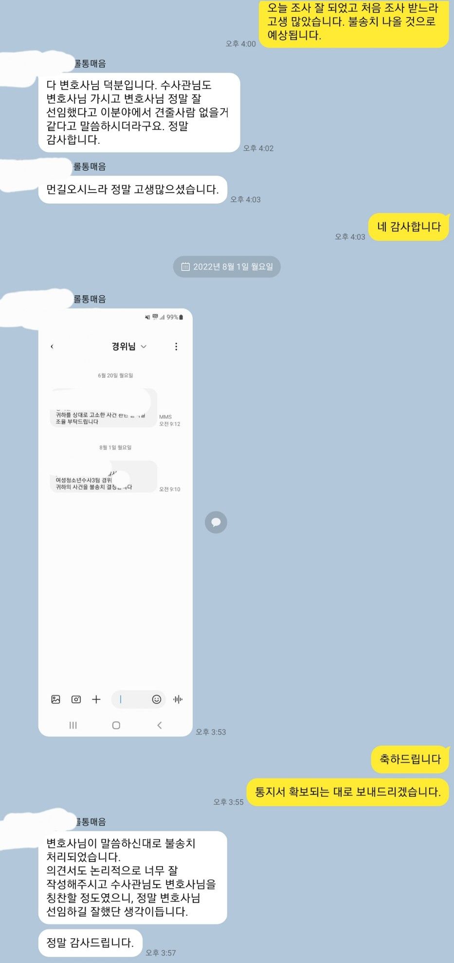 이 사건은 이의신청 이후 검사님의 불기소처분까지 이미 내려졌습니다. 제가 변호하는 많은 통매음 사건 중에서는 아직까지 불송치결정 이후 약식기소처분으로 바뀐 적이 한 번도 없어서 처분청을 검찰청으로 수정해야 하나 별 의미는 없는 것이라 표 수정은 하지 않았습니다.