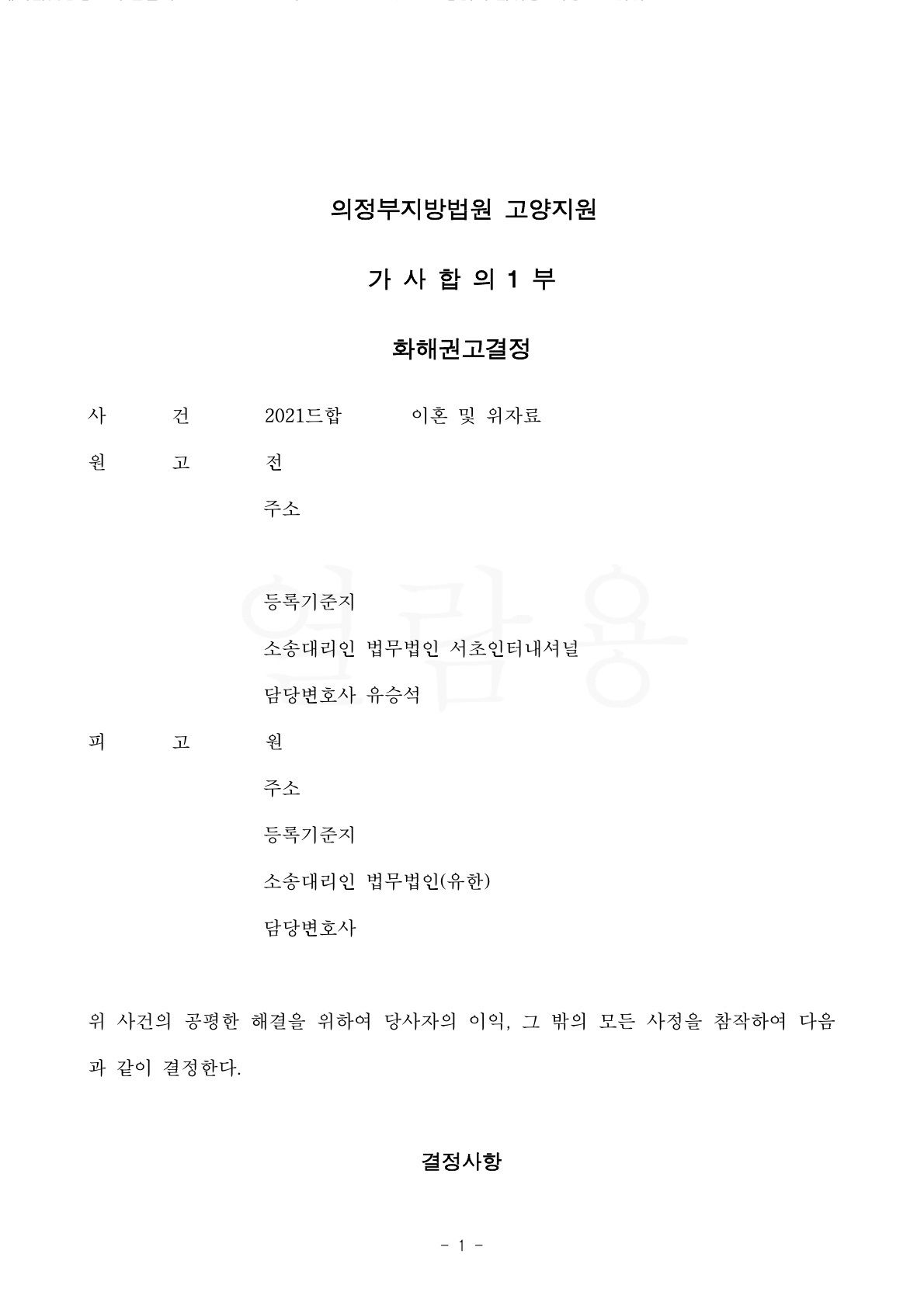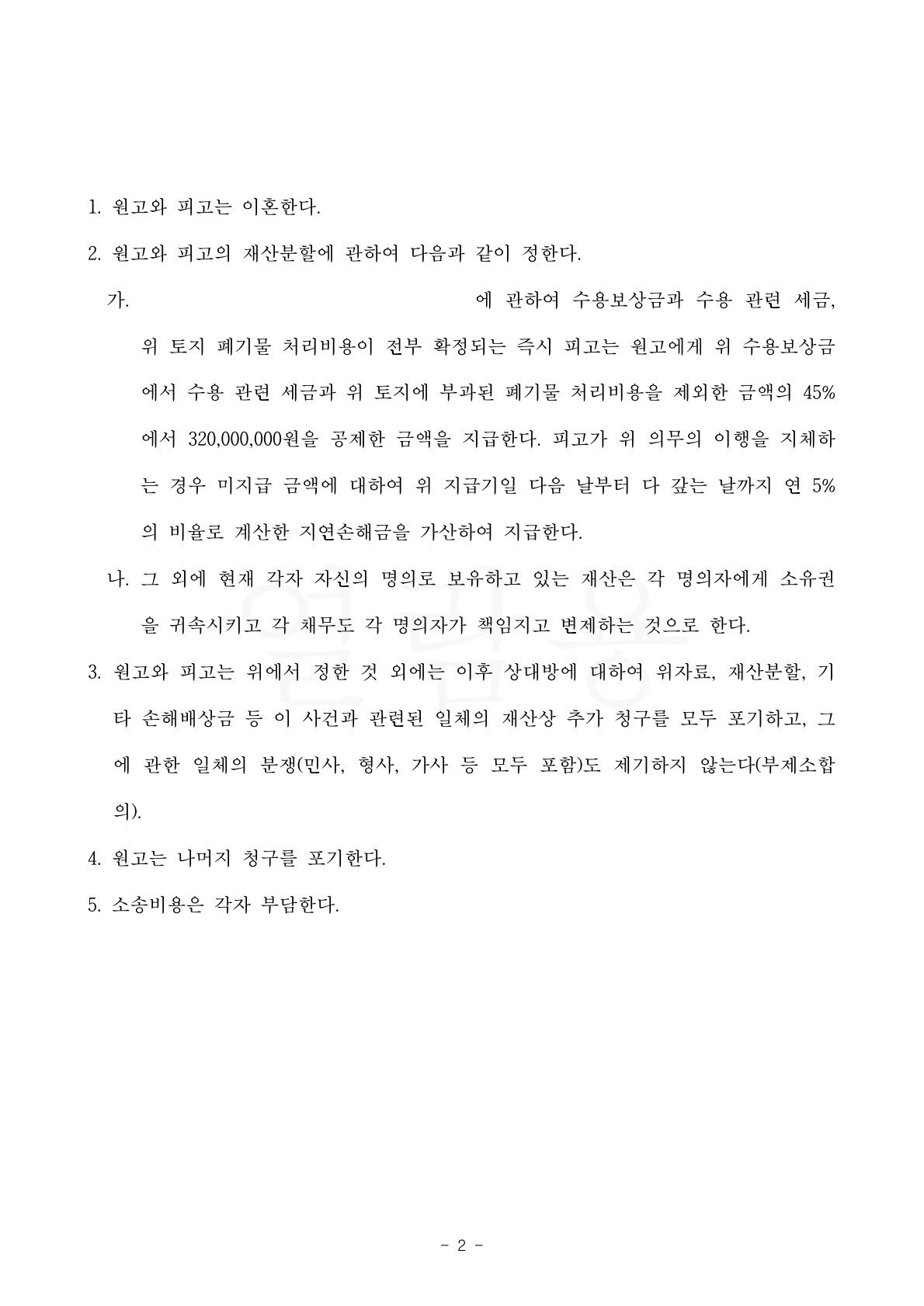 이에 본 변호사는 재판부께 장래에 지급 받게 될 토지수용보상금액을 기준으로 재산분할을 하면 된다는 주장을 피력하였고, 재판부에서 이를 받아 들여 화해권고결정으로 사건이 종결될 수 있었습니다. 나아가 시부모님으로부터 상속받은 재산이었지만 아내의 기여도를 적극 주장, 증명한 결과 기여도 45% 인정받게 되었습니다.