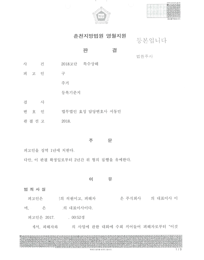 저는 즉시 피고인을 변호하면서 피고인에게 유리한 모든 양형사유를 법원에 제출하였고 한편 피해자와의 합의를 이끌어내었습니다. 결국 법원은 피고인에게 집행유예를 선고하였습니다.