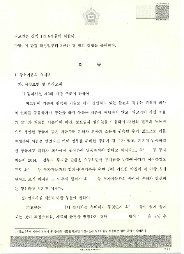 저는 항소심에서 이 사건의 경위, 의뢰인이 제품을 생산, 판매하게 된 계기, 회사와의 관계, 투자자와의 관계 등을 볼 때 업무상배임에 해당한다 할 수 없고, 가사 해당한다 하더라도 실형을 선고한 원심의 형이 지나치게 무거워 감형되어야 한다고 주장하였습니다. 항소심은 저희의 주장을 받아들여 원심을 파기하고 집행유예를 선고하여 의뢰인은 석방되었습니다.