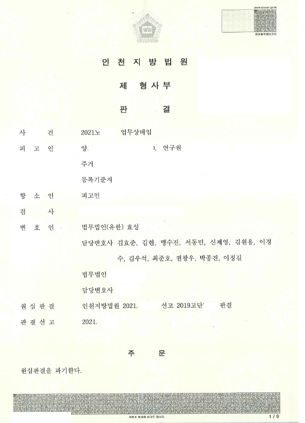 의뢰인은 제조 회사의 연구원인데 회사에서 생산하는 제품과 동일, 유사한 제품을 생산하여 판매하였다고 하여 회사로부터 업무상배임으로 고소당하여 제1심에서 실형을 선고받고 구속된 상태에서 저에게 항소심을 의뢰하였습니다.