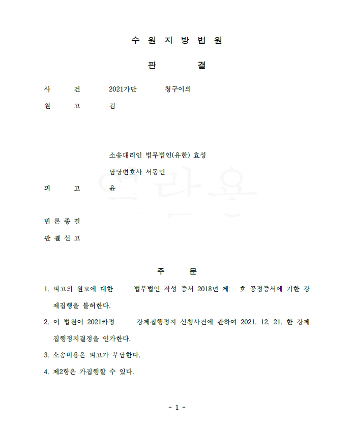 저는 즉각 채무불이행자명부등재사건에 사유서를 제출하여 등재를 막고 동시에 청구이의의의 소 및 강제집행정지신청을 하였고 법원은 저희의 주장을 모두 받아들여 청구이의의 소에서 전부 승소하고 채무불이행자명부등재신청은 기각되어 의뢰인은 채무 및 강제집행에서 벗어나게 되었습니다.
