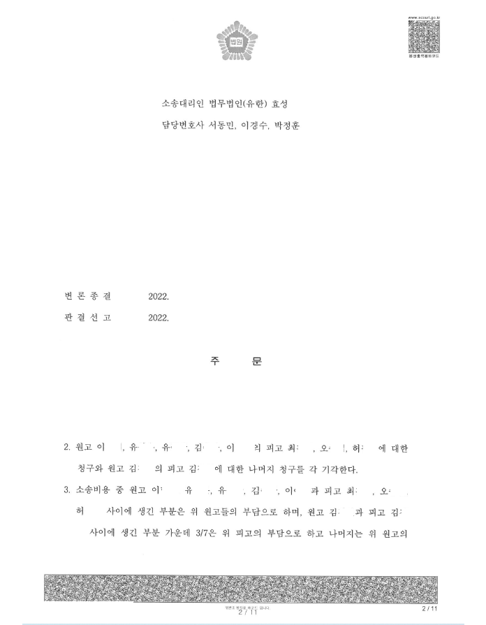 저는 즉각 응소하여 의뢰인은 투자회사의 직원에 불과하여 공동불법행위자가 아닌 점, 의뢰인도 원고들처럼 투자회사에 투자하여 손실을 입은 투자자인 점, 관련 사건에서 투자회사의 직원들이 전부 승소한 점 등을 적극적으로 주장 입증하여 법원은 원고 전부 패소 판결을 선고하였습니다.
