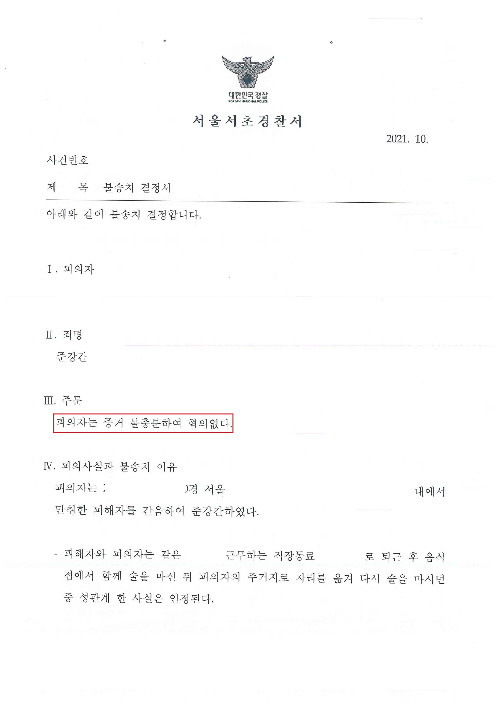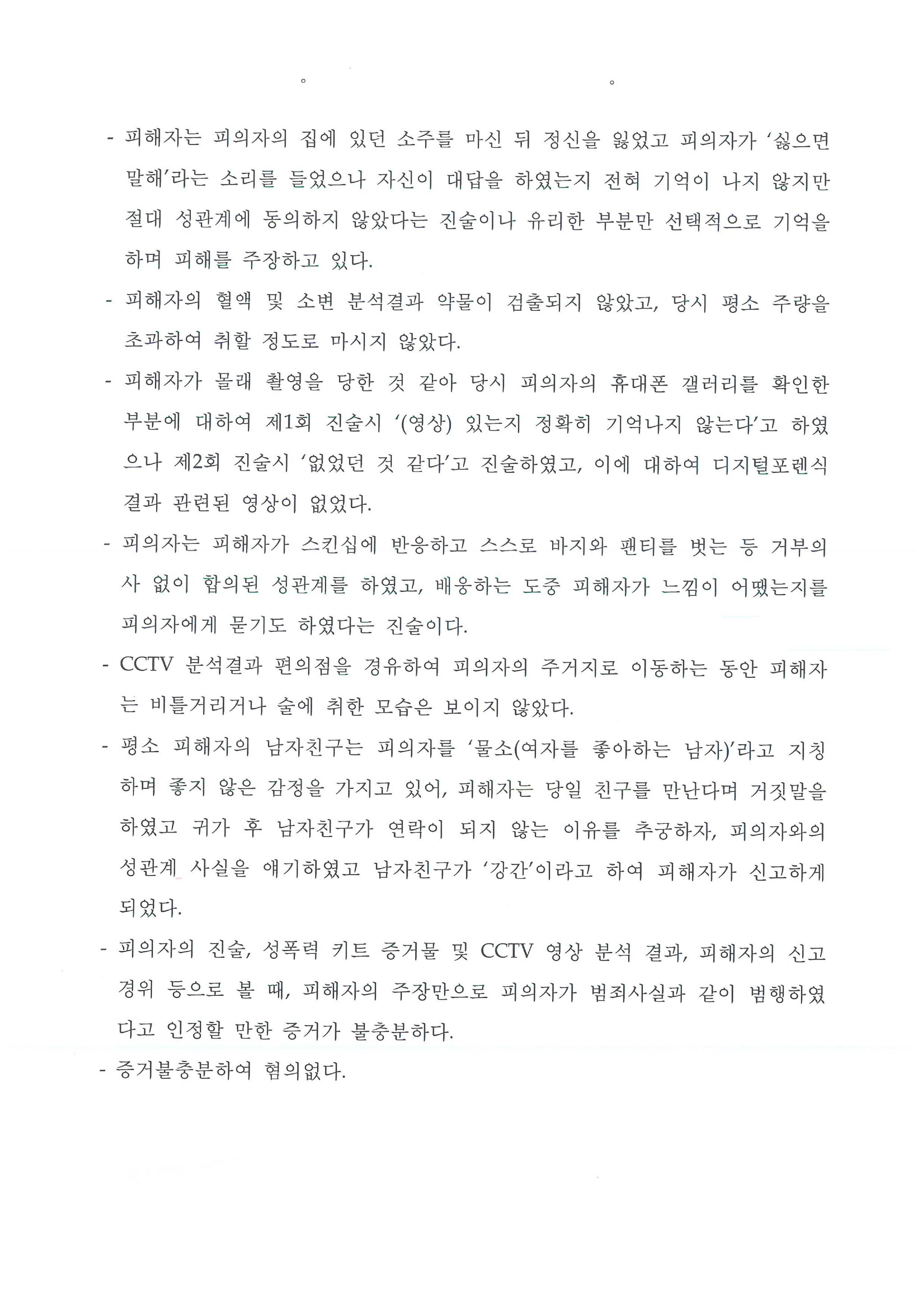 이 사건은 연인관계가 아니었고 사건 이전에 특별한 호감을 느끼지 않았던 피의자와 피해자가 술을 마시고 성관계를 하였던 사건으로, 전형적이라고 볼 수 있지만 피의자의 입장에서 관련 증거를 보유하고 있지 않아 방어를 하는 것이 쉽지 않은 상황이었습니다.