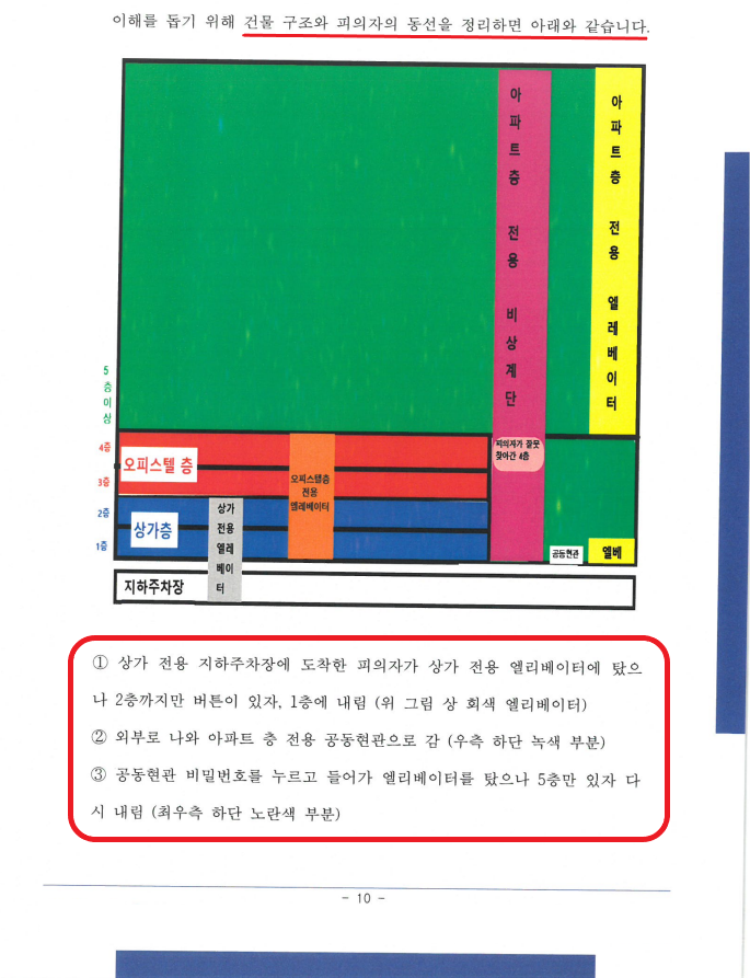 ⑤ 402호에서 지하주차장까지는 7분 정도 걸림. 설령 수사기관의 주장에 따라 피의자가 19:00에 입실하였더라도, 약 10분간 샤워하고 5분 만에 성관계를 마치고, 7분 안에 건물을 빠져나갔다는 것은 상식에 부합하지 않음.