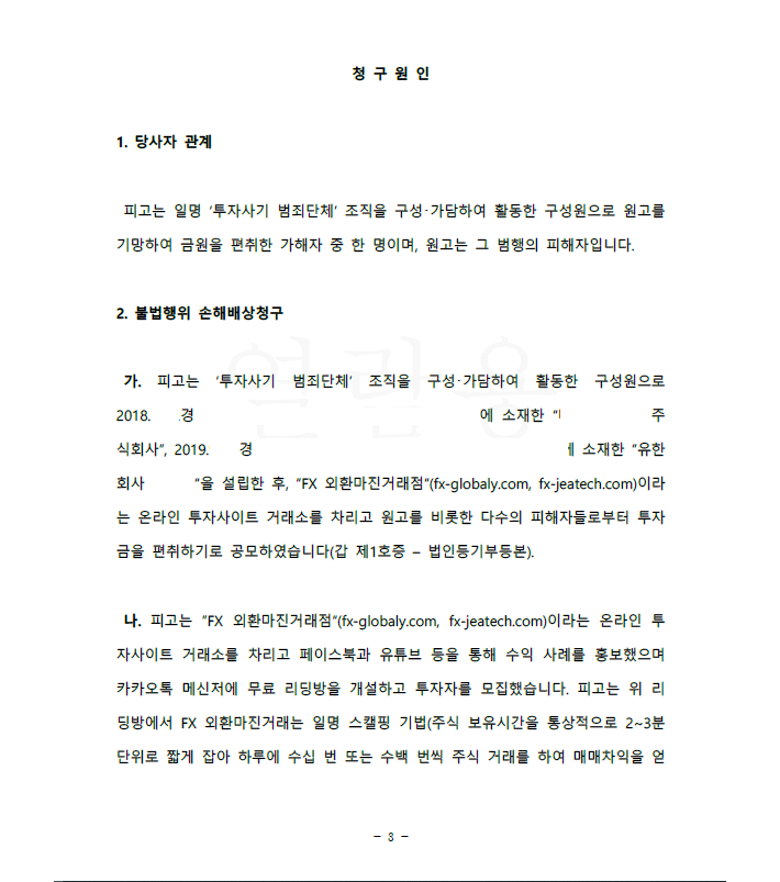 이 사건에서도 의뢰인은 투자 사기를 당한 후 저를 찾아오셨고 저는 바로 가해자를 피고로 하여 불법행위 손해배상청구의 민사소송을 제기하였습니다.