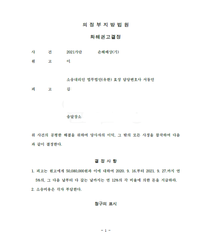 법원은 저희의 주장을 모두 받아들여 피고가 원고에게 피해액 전부를 지급하라는 화해권고결정을 내려 확정되어 의뢰인은 피해액을 반환받게 되었습니다.