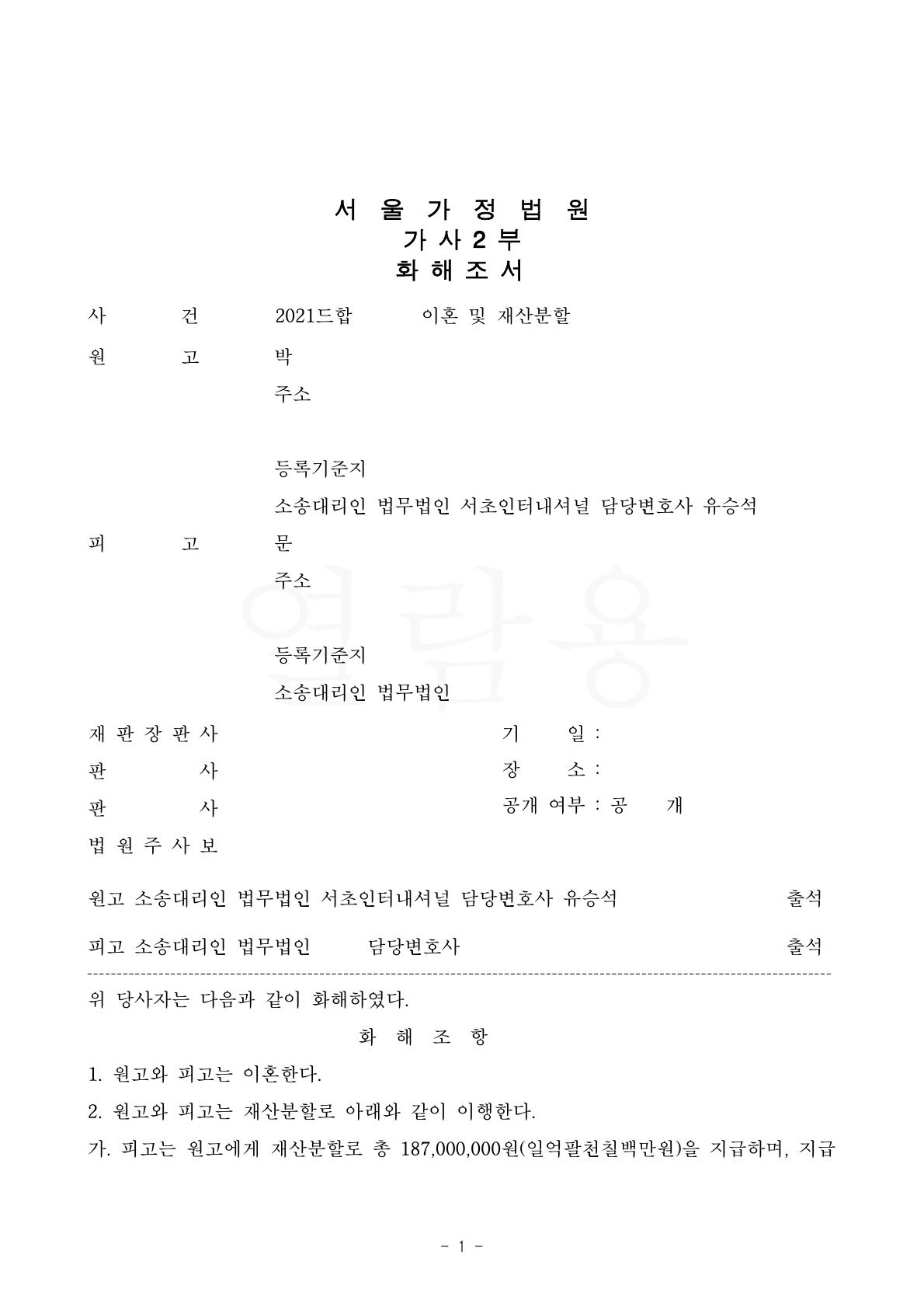 결국 남편측에서 저희에게 합의 의사를 타진해 왔고, 원만히 합의에 이르러 소송상 화해로 사건이 종결되게 되었습니다.