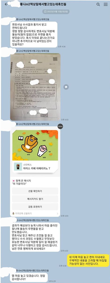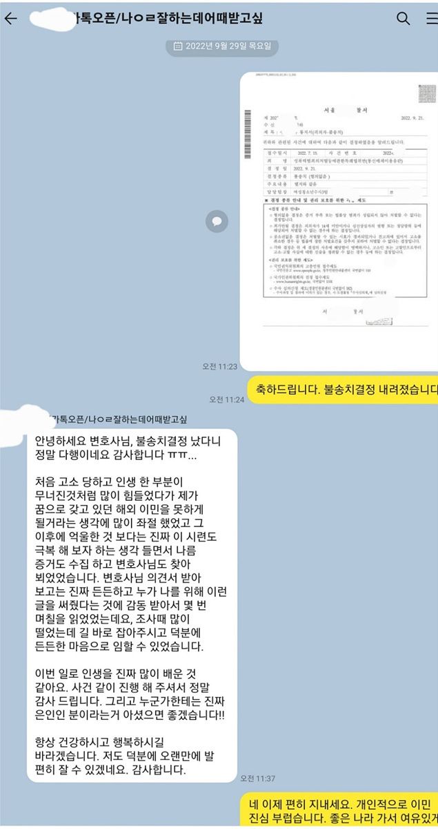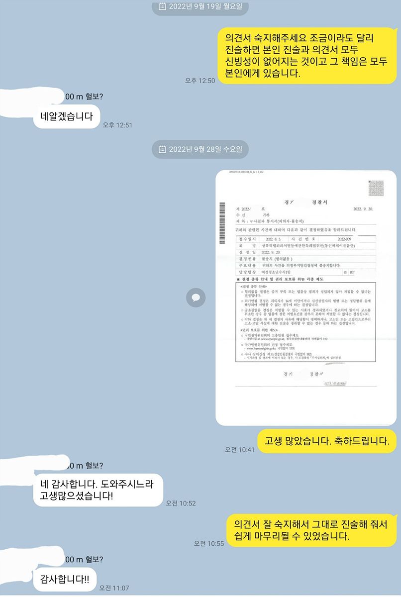 위 불송치통지서의 결정일을 보면 9월 20일로 되어 있습니다. 아래 대화내용을 보면 9월 19일 조사를 받았다는 것을 알 수 있을 것입니다. 조사를 받고 바로 다음날 불송치결정을 받았고 초고소으로 마무리한 사건이라 많은 사건들 중에서도 인상에 남습니다. 사건이 너무 싱겁게 끝나 특별히 더 언급할 것이 없습니다. 빠른 결정이 내려진 가장 큰 이유는 무엇보다 제가 작성해서 미리 전달한 의견서를 잘 숙지하였기 때문으로 생각됩니다.
