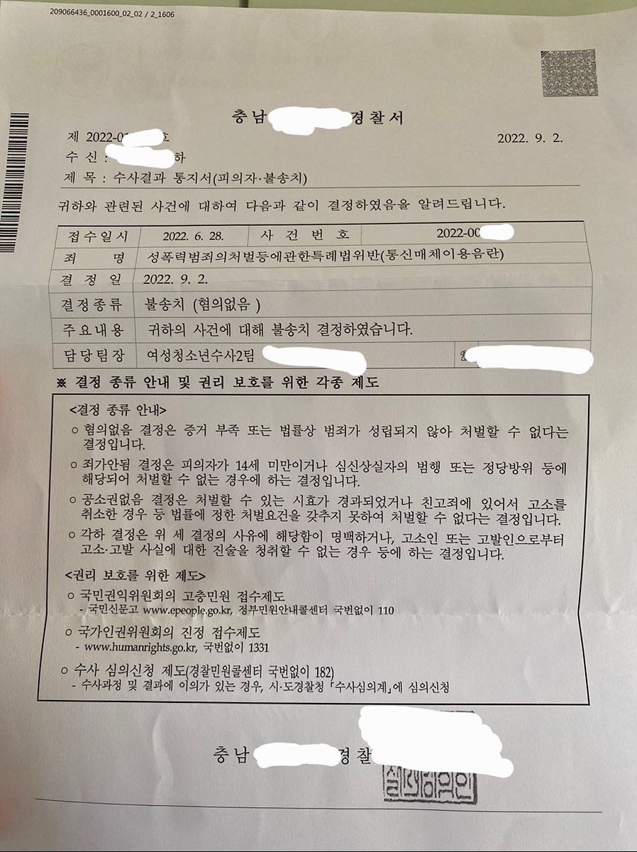 조사를 받고 바로 다음날 불송치결정이 내려진 사건이 있었습니다.