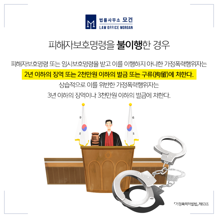 피해자보호명령을 받고 이를 이행하지 않은 가해자는 2년 이하의 징역 또는 2천만원 이하의 벌금 또는 구류에 처해 집니다. 또한 피해자의 보호를 위해 필요하다고 인정되는 경우에는 별도의 신변안전조치가 이루어질 수 있습니다.