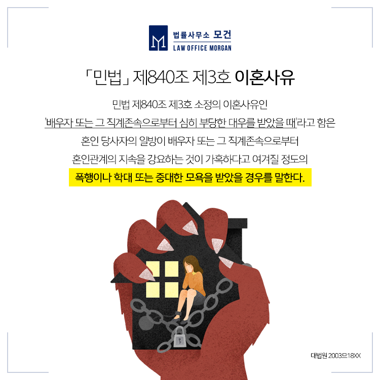 배우자가 폭력, 폭언 등으로 심히 부당한 대우를 받은 경우 이혼사유에 해당됩니다. 그러려면 가정폭력 사실에 대한 입증이 매우 중요하므로 경찰 신고기록이나 진단서, 폭행 부위의 사진, 집안 집기를 부순 사진, 폭언이 남긴 녹취록이나 메시지 등의 증거를 잘 남겨두는 것이 좋습니다. 가정폭력 피해자를 위한 여러 제도가 마련되어 있으나, 이를 적재적소에 잘 활용하지 못하면 현명하게 가정폭력을 벗어나는데 어려울 수 있습니다.