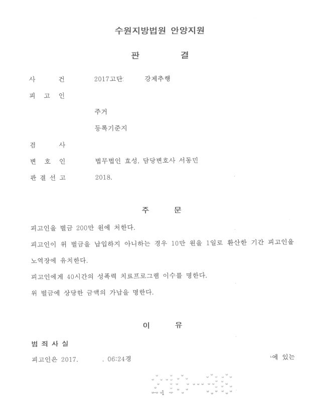 저는 즉각 변호인의견서를 제출하면서 피고인의 처벌 전력, 동종전과의 유무, 사건의 경위, 가해의 정도, 죄질 상황, 피고인의 가정환경 등 양형사유를 최대한 주장 제출하였습니다. 피해자가 완강히 거부하여 합의를 이끌어내지 못하였지만 합의 외 양형사유가 받아들여져 법원은 벌금형을 선고하였고 신상정보 고지명령 내지 공개명령도 면제하였습니다.
