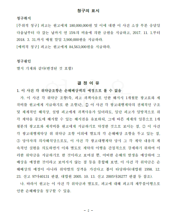 계약서의 위약금 조항에 따라 1개월치의 광고료만 지급하고 이는 손배액의 예정이므로 더 이상 지급할 금액이 없다고 주장하였습니다.