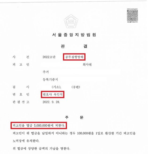 이러한 저의 조력을 바탕으로 A씨는 최근 엄히 처벌하고 있는 공무집행방해죄를 저지르고 피해 경찰과 합의하지 못하여 징역형으로 처벌받을 가능성이 매우 높았음에도 불구하고 벌금형을 선고받음으로써 회사에서 당연퇴직하게 될 위기에서 벗어날 수 있었습니다.