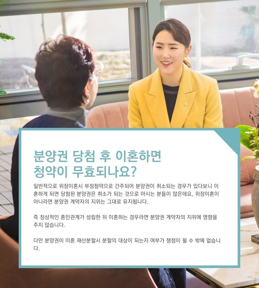즉 정상적인 혼인관계가 성립한 뒤 이혼하는 경우라면 분양권 계약자의 지위에 영향을 주지 않습니다.