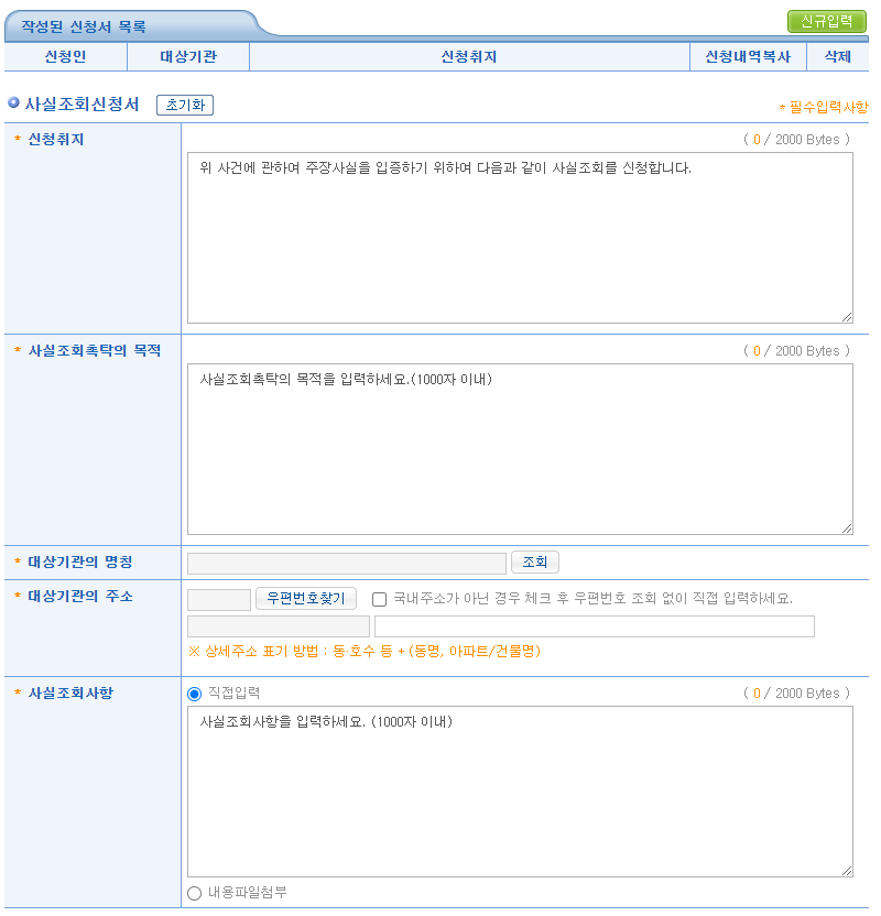 신청취지와 사실조회촉탁의 목적, 대상기관의 명칭등 필수입력사항을 모두 입력하고 제출하면 되는데요.